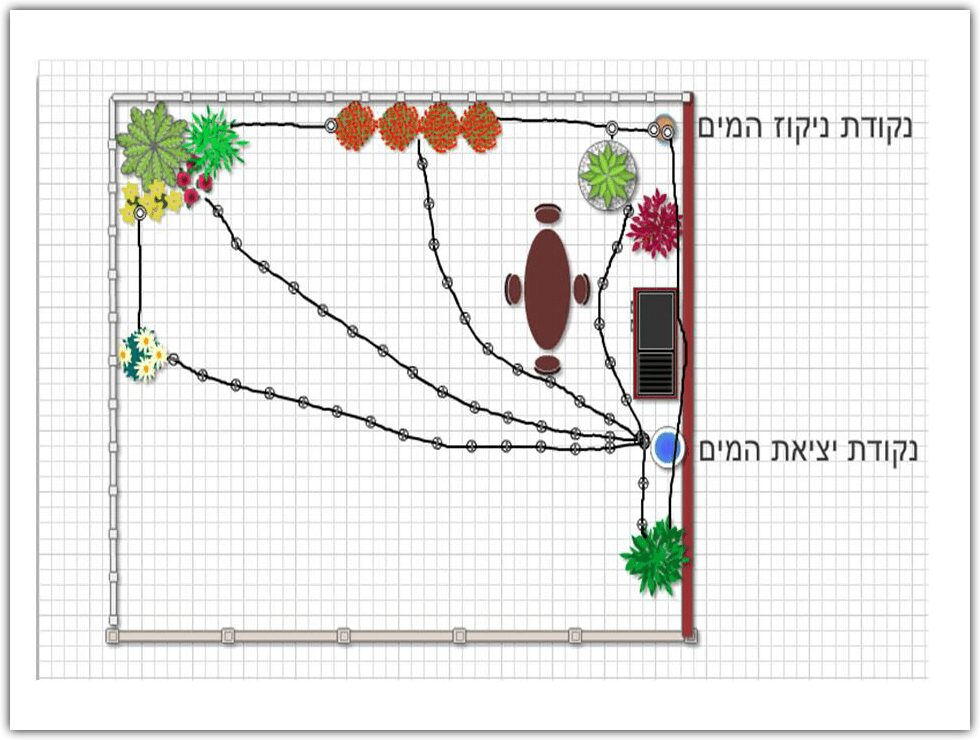 אין פשוט מכך – תגדיר את הנק' אליהם אתה ורצה להגיע עם צנרת השקיה וניקוז והנח את הצנרת ממקור המים כצמה אחת ממנה תתפצל לנק' אותן סימנת